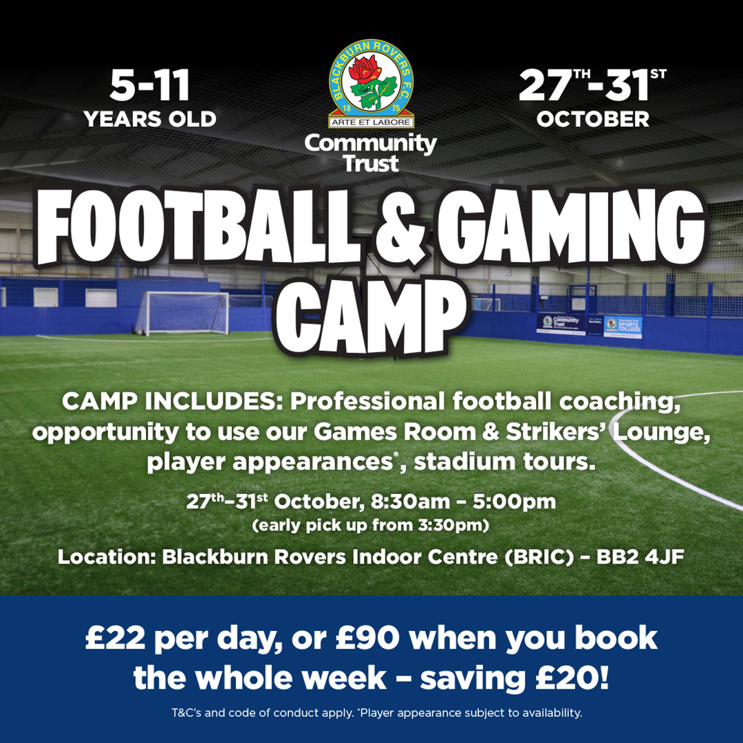Full course price: £60.00This October, Blackburn Rovers Community Trust are delivering Football and Gaming Camps, hosted at Blackburn Rovers Indoor centre. The facility is indoor but we would recommend participants bring warm clothing, pack lunch and non fizzy drinks are required for each participants. All participants will require indoor sports footwear. Football and other sport based activities during the week coached by our FA qualified team. *Professional Football coaching *Chance to meet Rovers players (men's/women's/academy players subject to availability) *Stadium Tours *Access to Strikers Lounge *Play in our GAME room *Play a variety of sports *Have lunch at Ewood Park everyday *Please could all lunches and snacks be nut free, as some children attending this session may have allergies.